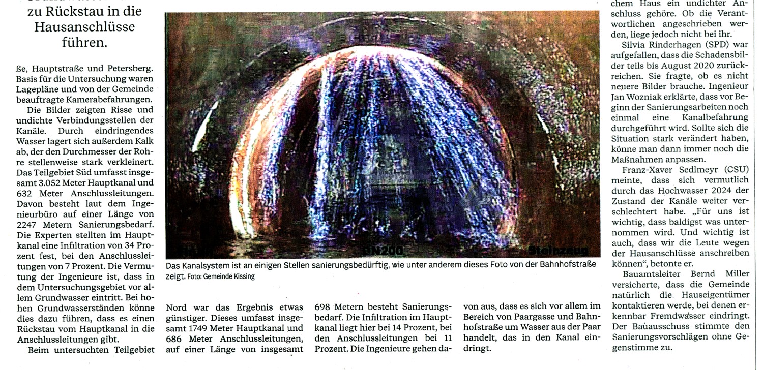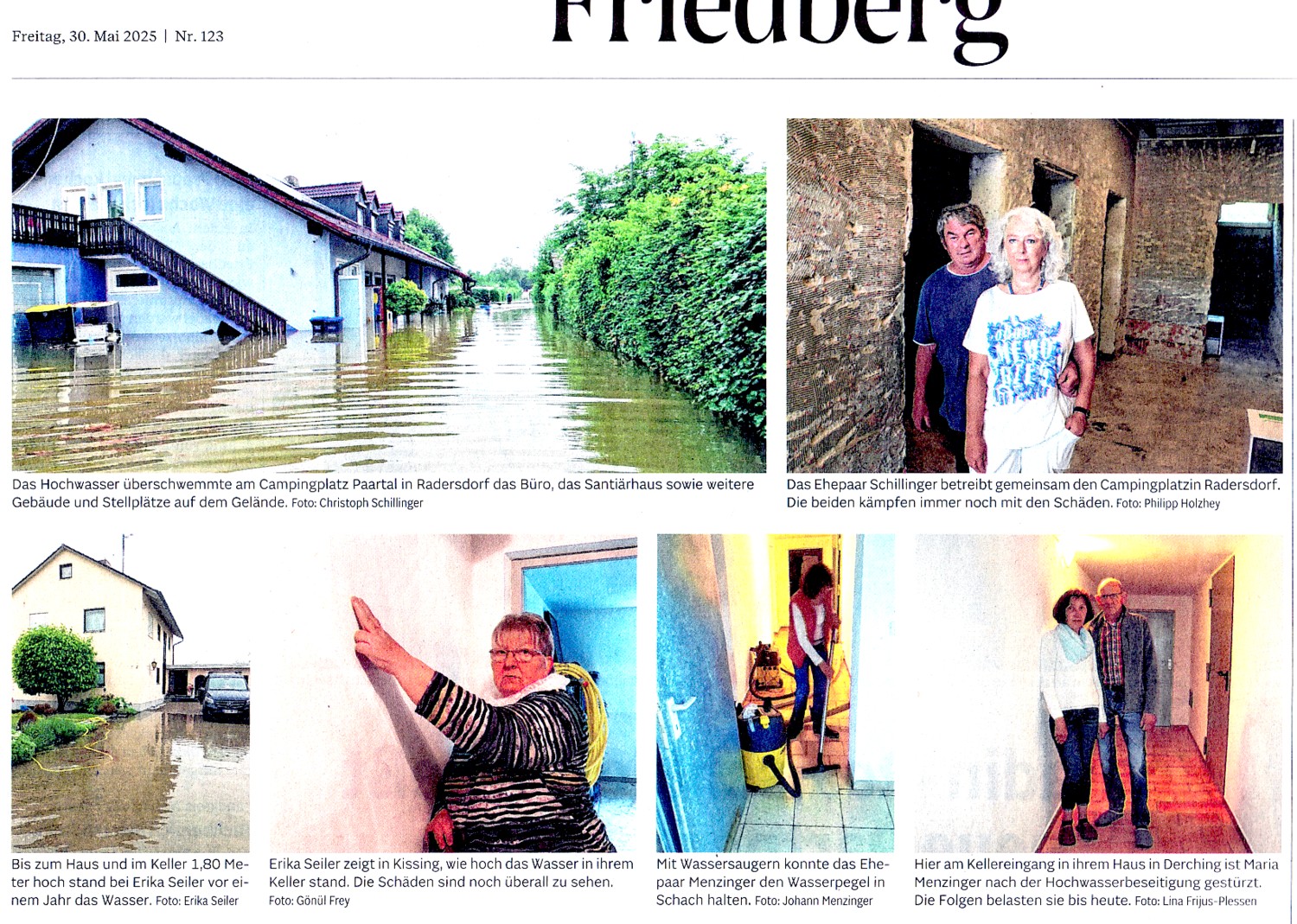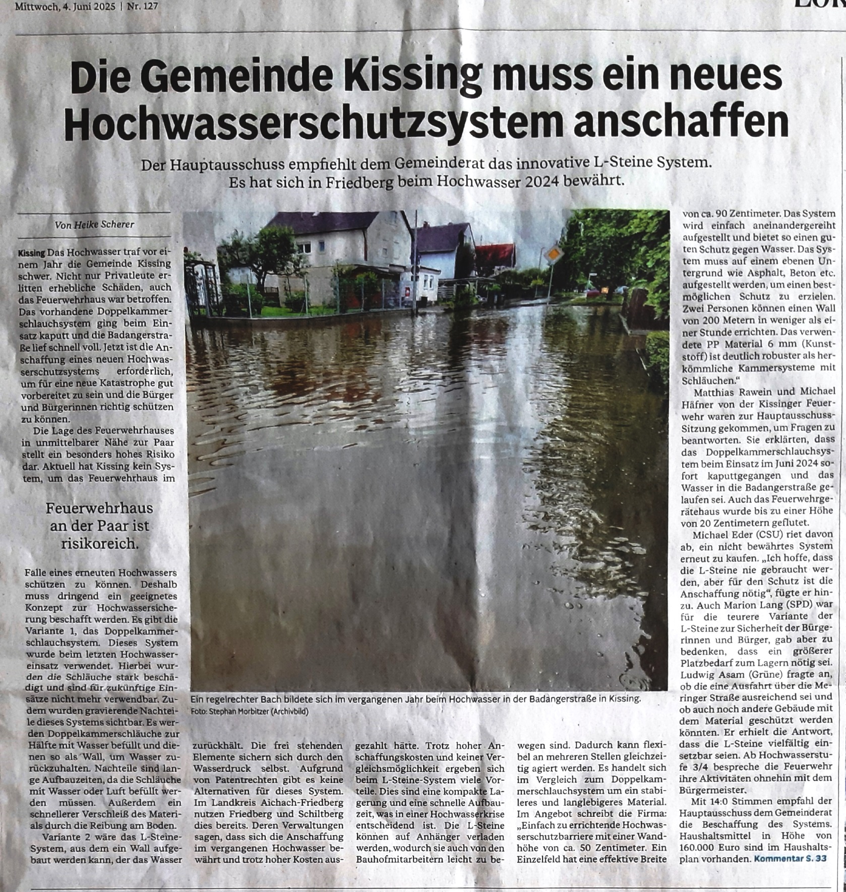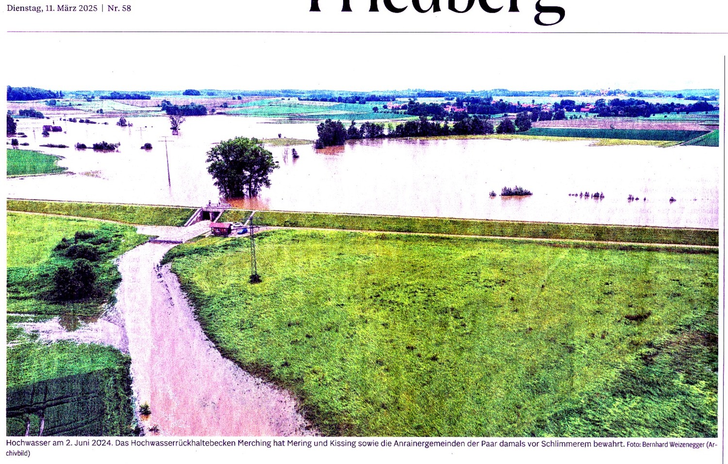 Aktualisiert am 02.08.2025Presse / Briefe / Aktuelle InformationenBerichte/Briefe zu Themen: Hochwasser/Paar/Lech 2025:29.07.2025 Leserbrief von A. Staffler zum Artikel vom 19.7.2025, s.u. 28.07.2025 Die Gemeinderat hat dem Beitritt zur "ARGE Solidarischer Hochwasserschutz" zugestimmt Der Jahresbeitrag beträgt 12.000 Euro. Ein >Digitaler Zwilling< , eine KI-App soll Vorwarn- Zeiten bis zu 24-Stunden ermöglichen, was im Katastrophenfall Zeit für gezielte Maßnahmen verschafft. 19.07.2025 Kissing prüft Beitritt zu Hochwasserprojekt (Link zur FA-Seite) Anmerkung zum Urheberrecht: Alle ab 1.8.2025 von der Friedberger Allgemeinen übernommenen Artikel dürfen nicht mehr gescannt bzw fotografiert übernommen werden. Auf diese darf nur noch per Link verwiesen werden. 11.06.2025 So steht es ums Kissinger Kanalsystem (1) und (2) (FA) 06.06.2025 Trocknet der Lech aus ? (1) und (2) (FA) 04.06.2025 Die Gemeinde Kissing muss ein neues Hochwasserschutzsystem anschaffen (FA) 30.05.2025 Ein Jahr nach dem Hochwasser (1) und (2) und (3) (FA) 11.03.2025 Technik und KI sollen vor Hochwasser schuetzen (1) und (2) (FA) 29.01.2025 Merching ärgert sich über Nachbar Mering (1) und (2) (FA) Berichte/Briefe zu Themen: Hochwasser/Paar/Lech 2024: 12.11.2024 Experten-Tipps zum Hochwasserschutz (1) und (2) und (3) (FA) 08.11.2024 Darum traf es Kissing so schwer (1) und (2) (FA) Bericht zu den Vorträgen des WWA-Don während einer Gemeinderatssitzung in Kissing 07.11.2024 Sind Anwesen bald gegen Hochwasser versicherbar? (FA) Bericht von der Jahreshauptversammlung am 15.10.2024 17.07.2024 Bauanleitung für Fenster-Dichtplatten + Bild1, Bild2, Bild3, Bild4, Bild5, Montagevideo (5 MByte) erstellt von Anton Staffler 24.06.2024 Grundwasserproblem: Welche Rolle spielt der Lech? (FA) 22.06.2024 Hochwasserschaeden von der Steuer absetzen (FA) 22.06.2024 Kissing sieht Neubau im Überschwemmungsgebiet kritisch (FA) 20.06.2024 Grundwasser im Lechtal steigt extrem (1) und (2) (FA) 20.06.2024 Wo gibt es Probleme im Kanalnetz? (1) und (2) (FA) Die Gemeinde nimmt Stellung (Kissing) 17.06.2024 Lage des Kanalnetzes beruhigt sich (FA) 15.06.2024 Fragen werden nicht beantwortet (FA-Leserbrief) 14.06.2024 Wie kann sich Mering besser schützen? (1) und (2) (FA) 12.06.2024 Warum sind die Kanäle überlastet (1) und (2) (FA) Beim lange anhaltenden Kanal-Rückstau gibt es drei große Themenbereiche: 1. Der Abwasserzweckverband Steindorf-Schmiechen-Merching-Mering-Kissing betreibt das Kanalsystem mit den beiden großen Röhren nach Augsburg. Diese wurden m.W. 1973 gebaut. Seitdem hat sich die Bevölkerungszahl nahezu verdoppelt- und es wird weiter gebaut. Muss dieses System erweitert werden? 2. Nachdem beim Schwabhof ein "Bypass" zum Augsburger Kanalsystem als Entlastungsmaßnahme gelegt wurde (eigentlich eine Überleitung) stellt sich die Frage, ob es nach dem Schwabhof eine Engstelle gibt, die man beseitigen müsste. 3. Git es Probleme, das Kissinger Kanalwasser in die beiden Röhren zu bekommen,, weil das von Mering kommende Wasser unter zu großem Druck steht? 12.06.2024 Sechs Tipps zur Hochwasservorsorge (1) und (2) (FA) Eine Zusammenstellung nützlicher Hinweise für alle Hochwasser-Geschadigten Die Berichte sprechen für sich. Zusammenfassend gilt für Mering und Kissing, dass ohne die beiden Rückhaltebecken die Schäden immens gewesen wären. Innerorts gab es nahezu kein Oberflächen- wasser. Das Grundwasser stieg auch nicht mehr so hoch wie 1999, verursachte aber trotzdem Wasser- schäden in erheblichem Umfang. Zudem drang es stärker in das Kanalnetz ein und verursachte große Schäden in den Wohnhäusern. Soviele große Pumpen habe ich in Kissing noch nie in Aktion gesehen. Heute, am 8.6., also nach 1 Woche, sind die Kanäle wieder nutzbar. Die vielerorts aufgestellten DIXI-Klos werden nicht mehr benötigt. Jetzt gilt es, nach den dringendsten Schutzmaßnahmen zu forschen: Aus Sicht der meisten Betroffenen muß das Kanalnetz schleunigst begutachtet und, wo nötig (fast überall) saniert oder punktuell komplett erneuert werden- Besonders die beiden großen Röhren von Mering bis Augsburg, westlich der B2, erwiesen sich als viel zu klein. Es gab tagelangen Rückstau.im Kanalnetz. 08.06.2024 Ursachen des Hochwassers (ein treffender Leserbrief aus FA) 08.06.2024 Beim Schutz seines Hauses ist er kreativ (1) und (2) (FA) 04.06.2024 Jetzt wird das Grundwasser zum Problem (FA) 04.06.2024 Becken sind weiterhin gut gefüllt (FA) 03.06.2024 Mering und Kissing gehen unter (1) und (2) (FA) 03.06.2024 Hochwasser in den umliegenden Gemeinden (FA) 03.06.2024 Land unter im Wittelsbacher Land (1) und (2) (FA) Das jahrelang befürchtete, große Hochwasser hat bis zum Juni 2024 gewartet, bis die Merchinger Staustufe endlich fertig war! Am 1.6. wurden beide Rückhalte- becken ihrer Feuertaufe unterzogen - und haben sie bestanden. Wenn es 1999 kein großes Hochwasser gegeben hätte, wären die beiden Becken nicht gebaut worden ! 28.05.2024 Uniper treibt Plaene fuer Wasserkraftwerk am Lech voran (FA) Im Hinblick auf Hochwassergefährdung ist gegen das Fließkraftwerk von Uniper nichts einzuwenden. 24.05.2024 Leserbrief- Vermeidbare Flutschaeden (FA) Der Leserbrief wendet sich gegen die "menschengemachten" Ursachen für Hochwassersituationen. Unsere Regierung und die EU, weniger die Bauern, die sich nur anpassen ( müssen) tragen dafür die Verantwortung. 13.04.2024 Vor mehr als 150 Jahren begann die Bändigung des Lechs (1) (FA) Vor mehr als 150 Jahren begann die Bändigung des Lechs (2) (FA) Der Artikel beschreibt, wie der Lech seit 1852 reguliert, kanalisiert, drangsaliert wurde. Dies mündete letztlich in den Bau von 23 Staustufen, die dem Lech jegliche Eigendynamik nahmen. Mit licca liber soll ihm nun in einem kleinen Teilstück wieder etwas Freiheit zugestanden werden - zum Vorteil von Natur und Hochwasserschutz. Berichte/Briefe zu Themen: Hochwasser/Paar/Lech 2023: 29.07.2023 In Kissing kommt die Gefahr von unten (FA) Beim Pfingsthochwasser 1
