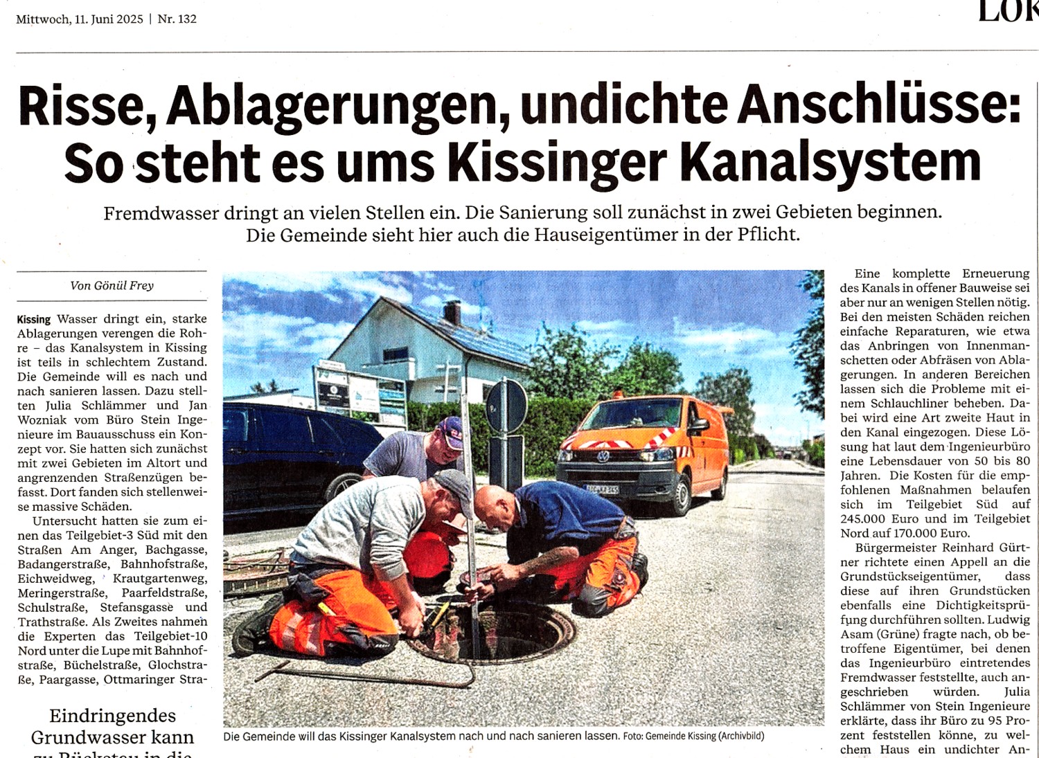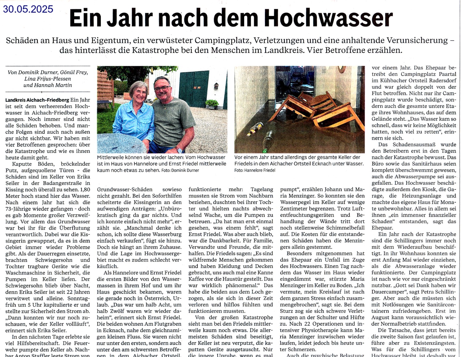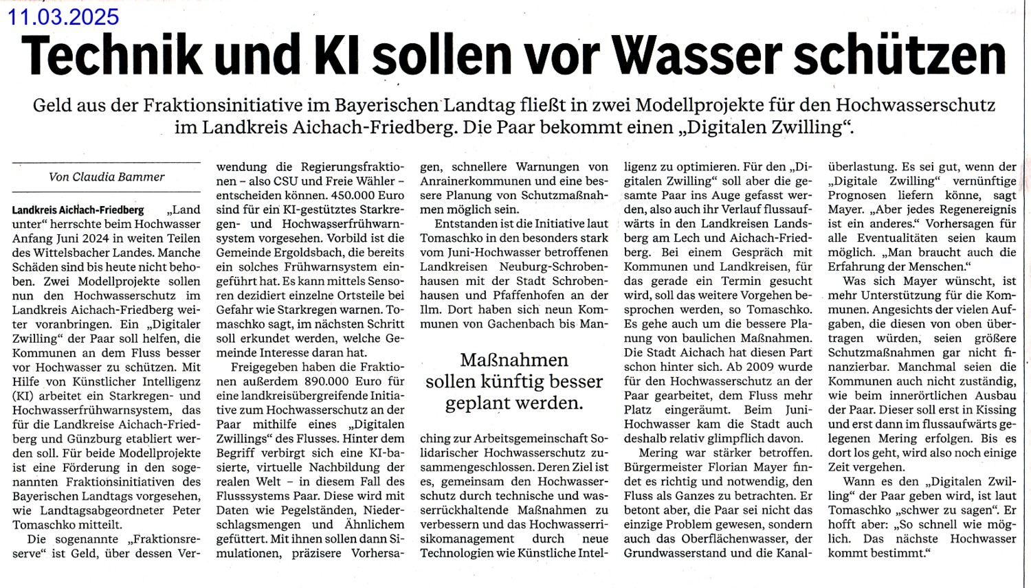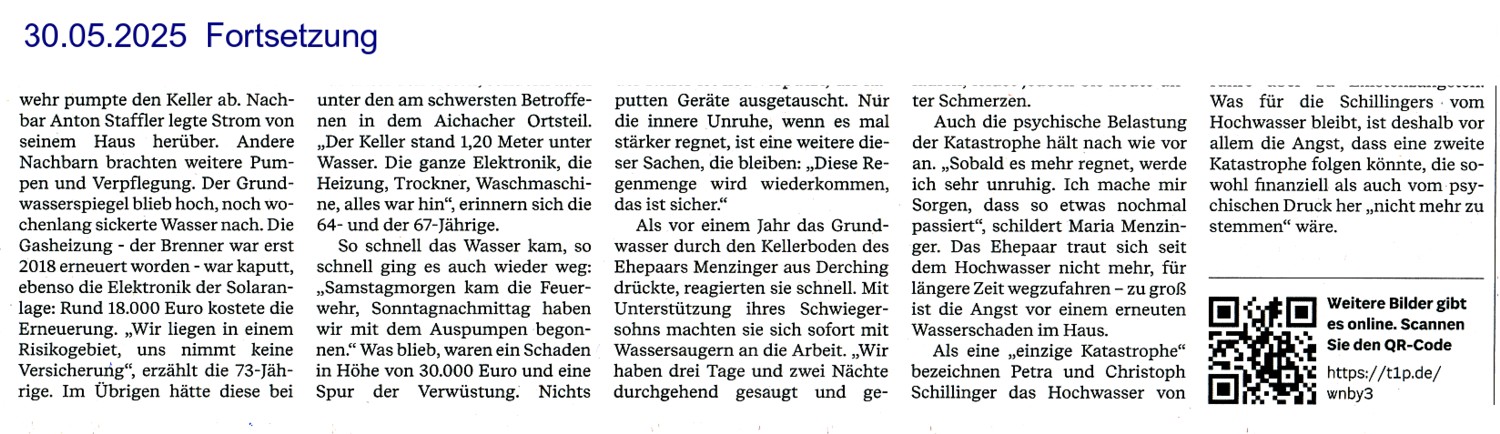 Aktualisiert am 02.08.2025Presse / Briefe / Aktuelle InformationenBerichte/Briefe zu Themen: Hochwasser/Paar/Lech 2025:29.07.2025 Leserbrief von A. Staffler zum Artikel vom 19.7.2025, s.u. 28.07.2025 Die Gemeinderat hat dem Beitritt zur "ARGE Solidarischer Hochwasserschutz" zugestimmt Der Jahresbeitrag beträgt 12.000 Euro. Ein >Digitaler Zwilling< , eine KI-App soll Vorwarn- Zeiten bis zu 24-Stunden ermöglichen, was im Katastrophenfall Zeit für gezielte Maßnahmen verschafft. 19.07.2025 Kissing prüft Beitritt zu Hochwasserprojekt (Link zur FA-Seite) Anmerkung zum Urheberrecht: Alle ab 1.8.2025 von der Friedberger Allgemeinen übernommenen Artikel dürfen nicht mehr gescannt bzw fotografiert übernommen werden. Auf diese darf nur noch per Link verwiesen werden. 11.06.2025 So steht es ums Kissinger Kanalsystem (1) und (2) (FA) 06.06.2025 Trocknet der Lech aus ? (1) und (2) (FA) 04.06.2025 Die Gemeinde Kissing muss ein neues Hochwasserschutzsystem anschaffen (FA) 30.05.2025 Ein Jahr nach dem Hochwasser (1) und (2) und (3) (FA) 11.03.2025 Technik und KI sollen vor Hochwasser schuetzen (1) und (2) (FA) 29.01.2025 Merching ärgert sich über Nachbar Mering (1) und (2) (FA) Berichte/Briefe zu Themen: Hochwasser/Paar/Lech 2024: 12.11.2024 Experten-Tipps zum Hochwasserschutz (1) und (2) und (3) (FA) 08.11.2024 Darum traf es Kissing so schwer (1) und (2) (FA) Bericht zu den Vorträgen des WWA-Don während einer Gemeinderatssitzung in Kissing 07.11.2024 Sind Anwesen bald gegen Hochwasser versicherbar? (FA) Bericht von der Jahreshauptversammlung am 15.10.2024 17.07.2024 Bauanleitung für Fenster-Dichtplatten + Bild1, Bild2, Bild3, Bild4, Bild5, Montagevideo (5 MByte) erstellt von Anton Staffler 24.06.2024 Grundwasserproblem: Welche Rolle spielt der Lech? (FA) 22.06.2024 Hochwasserschaeden von der Steuer absetzen (FA) 22.06.2024 Kissing sieht Neubau im Überschwemmungsgebiet kritisch (FA) 20.06.2024 Grundwasser im Lechtal steigt extrem (1) und (2) (FA) 20.06.2024 Wo gibt es Probleme im Kanalnetz? (1) und (2) (FA) Die Gemeinde nimmt Stellung (Kissing) 17.06.2024 Lage des Kanalnetzes beruhigt sich (FA) 15.06.2024 Fragen werden nicht beantwortet (FA-Leserbrief) 14.06.2024 Wie kann sich Mering besser schützen? (1) und (2) (FA) 12.06.2024 Warum sind die Kanäle überlastet (1) und (2) (FA) Beim lange anhaltenden Kanal-Rückstau gibt es drei große Themenbereiche: 1. Der Abwasserzweckverband Steindorf-Schmiechen-Merching-Mering-Kissing betreibt das Kanalsystem mit den beiden großen Röhren nach Augsburg. Diese wurden m.W. 1973 gebaut. Seitdem hat sich die Bevölkerungszahl nahezu verdoppelt- und es wird weiter gebaut. Muss dieses System erweitert werden? 2. Nachdem beim Schwabhof ein "Bypass" zum Augsburger Kanalsystem als Entlastungsmaßnahme gelegt wurde (eigentlich eine Überleitung) stellt sich die Frage, ob es nach dem Schwabhof eine Engstelle gibt, die man beseitigen müsste. 3. Git es Probleme, das Kissinger Kanalwasser in die beiden Röhren zu bekommen,, weil das von Mering kommende Wasser unter zu großem Druck steht? 12.06.2024 Sechs Tipps zur Hochwasservorsorge (1) und (2) (FA) Eine Zusammenstellung nützlicher Hinweise für alle Hochwasser-Geschadigten Die Berichte sprechen für sich. Zusammenfassend gilt für Mering und Kissing, dass ohne die beiden Rückhaltebecken die Schäden immens gewesen wären. Innerorts gab es nahezu kein Oberflächen- wasser. Das Grundwasser stieg auch nicht mehr so hoch wie 1999, verursachte aber trotzdem Wasser- schäden in erheblichem Umfang. Zudem drang es stärker in das Kanalnetz ein und verursachte große Schäden in den Wohnhäusern. Soviele große Pumpen habe ich in Kissing noch nie in Aktion gesehen. Heute, am 8.6., also nach 1 Woche, sind die Kanäle wieder nutzbar. Die vielerorts aufgestellten DIXI-Klos werden nicht mehr benötigt. Jetzt gilt es, nach den dringendsten Schutzmaßnahmen zu forschen: Aus Sicht der meisten Betroffenen muß das Kanalnetz schleunigst begutachtet und, wo nötig (fast überall) saniert oder punktuell komplett erneuert werden- Besonders die beiden großen Röhren von Mering bis Augsburg, westlich der B2, erwiesen sich als viel zu klein. Es gab tagelangen Rückstau.im Kanalnetz. 08.06.2024 Ursachen des Hochwassers (ein treffender Leserbrief aus FA) 08.06.2024 Beim Schutz seines Hauses ist er kreativ (1) und (2) (FA) 04.06.2024 Jetzt wird das Grundwasser zum Problem (FA) 04.06.2024 Becken sind weiterhin gut gefüllt (FA) 03.06.2024 Mering und Kissing gehen unter (1) und (2) (FA) 03.06.2024 Hochwasser in den umliegenden Gemeinden (FA) 03.06.2024 Land unter im Wittelsbacher Land (1) und (2) (FA) Das jahrelang befürchtete, große Hochwasser hat bis zum Juni 2024 gewartet, bis die Merchinger Staustufe endlich fertig war! Am 1.6. wurden beide Rückhalte- becken ihrer Feuertaufe unterzogen - und haben sie bestanden. Wenn es 1999 kein großes Hochwasser gegeben hätte, wären die beiden Becken nicht gebaut worden ! 28.05.2024 Uniper treibt Plaene fuer Wasserkraftwerk am Lech voran (FA) Im Hinblick auf Hochwassergefährdung ist gegen das Fließkraftwerk von Uniper nichts einzuwenden. 24.05.2024 Leserbrief- Vermeidbare Flutschaeden (FA) Der Leserbrief wendet sich gegen die "menschengemachten" Ursachen für Hochwassersituationen. Unsere Regierung und die EU, weniger die Bauern, die sich nur anpassen ( müssen) tragen dafür die Verantwortung. 13.04.2024 Vor mehr als 150 Jahren begann die Bändigung des Lechs (1) (FA) Vor mehr als 150 Jahren begann die Bändigung des Lechs (2) (FA) Der Artikel beschreibt, wie der Lech seit 1852 reguliert, kanalisiert, drangsaliert wurde. Dies mündete letztlich in den Bau von 23 Staustufen, die dem Lech jegliche Eigendynamik nahmen. Mit licca liber soll ihm nun in einem kleinen Teilstück wieder etwas Freiheit zugestanden werden - zum Vorteil von Natur und Hochwasserschutz. Berichte/Briefe zu Themen: Hochwasser/Paar/Lech 2023: 29.07.2023 In Kissing kommt die Gefahr von unten (FA) Beim Pfingsthochwasser 1