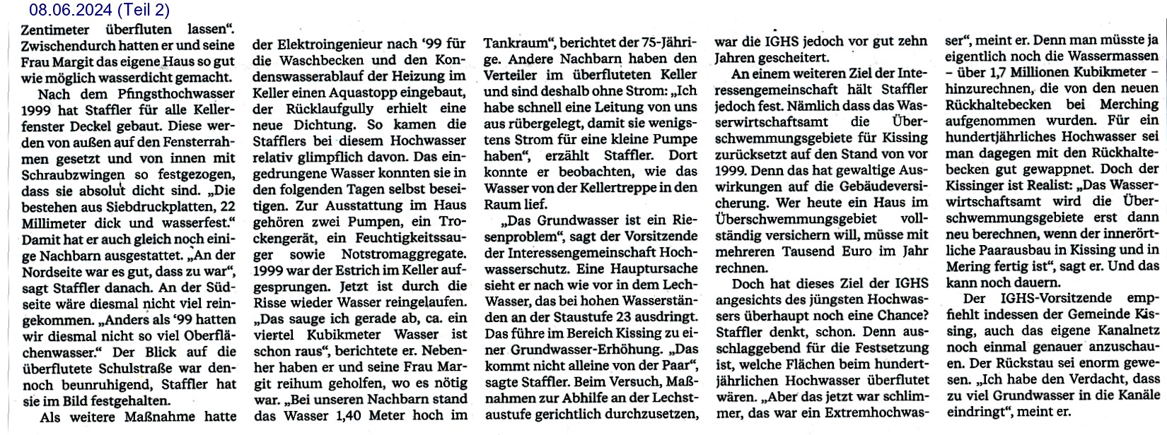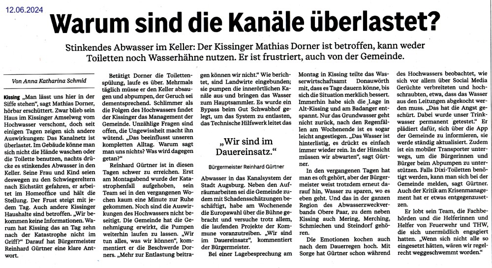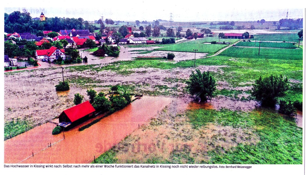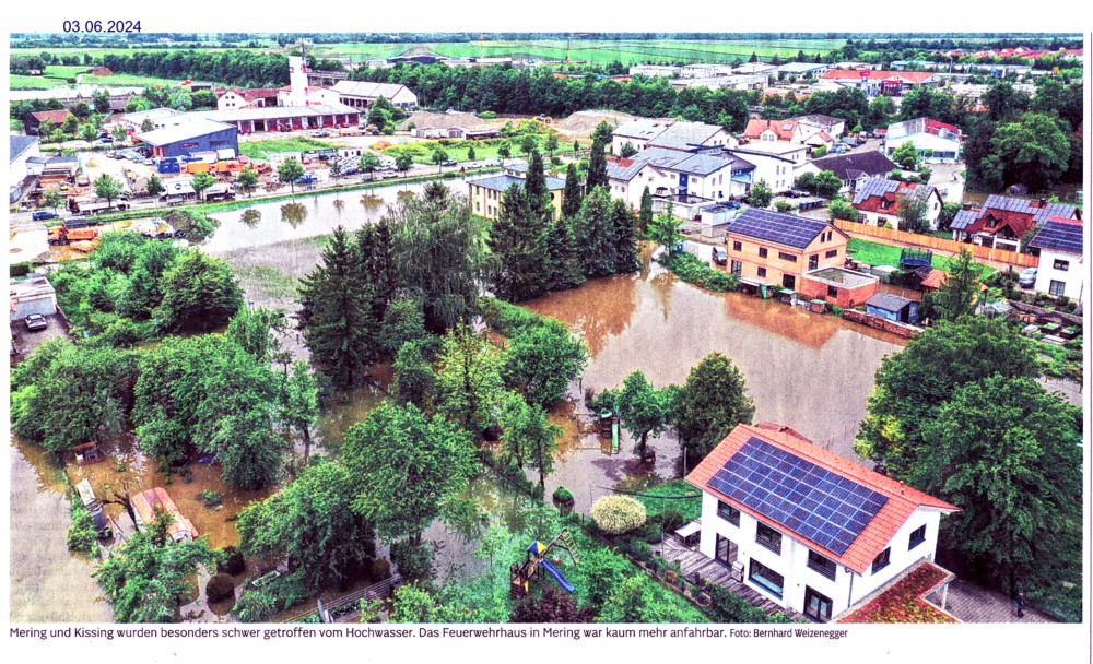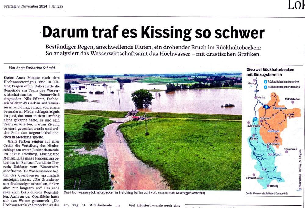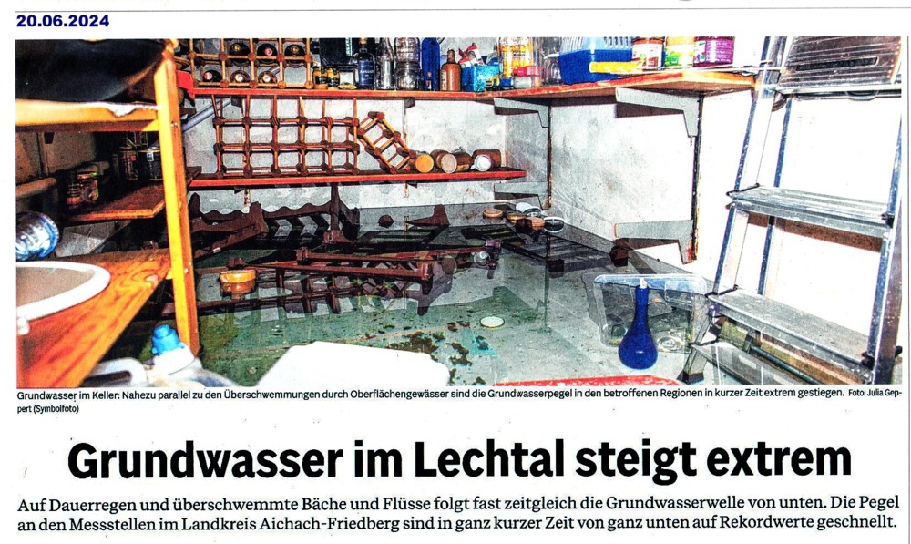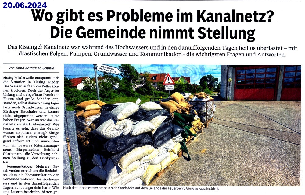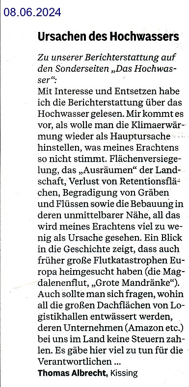 Aktualisiert am 02.08.2025Presse / Briefe / Aktuelle InformationenBerichte/Briefe zu Themen: Hochwasser/Paar/Lech 2025:29.07.2025 Leserbrief von A. Staffler zum Artikel vom 19.7.2025, s.u. 28.07.2025 Die Gemeinderat hat dem Beitritt zur "ARGE Solidarischer Hochwasserschutz" zugestimmt Der Jahresbeitrag beträgt 12.000 Euro. Ein >Digitaler Zwilling< , eine KI-App soll Vorwarn- Zeiten bis zu 24-Stunden ermöglichen, was im Katastrophenfall Zeit für gezielte Maßnahmen verschafft. 19.07.2025 Kissing prüft Beitritt zu Hochwasserprojekt (Link zur FA-Seite) Anmerkung zum Urheberrecht: Alle ab 1.8.2025 von der Friedberger Allgemeinen übernommenen Artikel dürfen nicht mehr gescannt bzw fotografiert übernommen werden. Auf diese darf nur noch per Link verwiesen werden. 11.06.2025 So steht es ums Kissinger Kanalsystem (1) und (2) (FA) 06.06.2025 Trocknet der Lech aus ? (1) und (2) (FA) 04.06.2025 Die Gemeinde Kissing muss ein neues Hochwasserschutzsystem anschaffen (FA) 30.05.2025 Ein Jahr nach dem Hochwasser (1) und (2) und (3) (FA) 11.03.2025 Technik und KI sollen vor Hochwasser schuetzen (1) und (2) (FA) 29.01.2025 Merching ärgert sich über Nachbar Mering (1) und (2) (FA) Berichte/Briefe zu Themen: Hochwasser/Paar/Lech 2024: 12.11.2024 Experten-Tipps zum Hochwasserschutz (1) und (2) und (3) (FA) 08.11.2024 Darum traf es Kissing so schwer (1) und (2) (FA) Bericht zu den Vorträgen des WWA-Don während einer Gemeinderatssitzung in Kissing 07.11.2024 Sind Anwesen bald gegen Hochwasser versicherbar? (FA) Bericht von der Jahreshauptversammlung am 15.10.2024 17.07.2024 Bauanleitung für Fenster-Dichtplatten + Bild1, Bild2, Bild3, Bild4, Bild5, Montagevideo (5 MByte) erstellt von Anton Staffler 24.06.2024 Grundwasserproblem: Welche Rolle spielt der Lech? (FA) 22.06.2024 Hochwasserschaeden von der Steuer absetzen (FA) 22.06.2024 Kissing sieht Neubau im Überschwemmungsgebiet kritisch (FA) 20.06.2024 Grundwasser im Lechtal steigt extrem (1) und (2) (FA) 20.06.2024 Wo gibt es Probleme im Kanalnetz? (1) und (2) (FA) Die Gemeinde nimmt Stellung (Kissing) 17.06.2024 Lage des Kanalnetzes beruhigt sich (FA) 15.06.2024 Fragen werden nicht beantwortet (FA-Leserbrief) 14.06.2024 Wie kann sich Mering besser schützen? (1) und (2) (FA) 12.06.2024 Warum sind die Kanäle überlastet (1) und (2) (FA) Beim lange anhaltenden Kanal-Rückstau gibt es drei große Themenbereiche: 1. Der Abwasserzweckverband Steindorf-Schmiechen-Merching-Mering-Kissing betreibt das Kanalsystem mit den beiden großen Röhren nach Augsburg. Diese wurden m.W. 1973 gebaut. Seitdem hat sich die Bevölkerungszahl nahezu verdoppelt- und es wird weiter gebaut. Muss dieses System erweitert werden? 2. Nachdem beim Schwabhof ein "Bypass" zum Augsburger Kanalsystem als Entlastungsmaßnahme gelegt wurde (eigentlich eine Überleitung) stellt sich die Frage, ob es nach dem Schwabhof eine Engstelle gibt, die man beseitigen müsste. 3. Git es Probleme, das Kissinger Kanalwasser in die beiden Röhren zu bekommen,, weil das von Mering kommende Wasser unter zu großem Druck steht? 12.06.2024 Sechs Tipps zur Hochwasservorsorge (1) und (2) (FA) Eine Zusammenstellung nützlicher Hinweise für alle Hochwasser-Geschadigten Die Berichte sprechen für sich. Zusammenfassend gilt für Mering und Kissing, dass ohne die beiden Rückhaltebecken die Schäden immens gewesen wären. Innerorts gab es nahezu kein Oberflächen- wasser. Das Grundwasser stieg auch nicht mehr so hoch wie 1999, verursachte aber trotzdem Wasser- schäden in erheblichem Umfang. Zudem drang es stärker in das Kanalnetz ein und verursachte große Schäden in den Wohnhäusern. Soviele große Pumpen habe ich in Kissing noch nie in Aktion gesehen. Heute, am 8.6., also nach 1 Woche, sind die Kanäle wieder nutzbar. Die vielerorts aufgestellten DIXI-Klos werden nicht mehr benötigt. Jetzt gilt es, nach den dringendsten Schutzmaßnahmen zu forschen: Aus Sicht der meisten Betroffenen muß das Kanalnetz schleunigst begutachtet und, wo nötig (fast überall) saniert oder punktuell komplett erneuert werden- Besonders die beiden großen Röhren von Mering bis Augsburg, westlich der B2, erwiesen sich als viel zu klein. Es gab tagelangen Rückstau.im Kanalnetz. 08.06.2024 Ursachen des Hochwassers (ein treffender Leserbrief aus FA) 08.06.2024 Beim Schutz seines Hauses ist er kreativ (1) und (2) (FA) 04.06.2024 Jetzt wird das Grundwasser zum Problem (FA) 04.06.2024 Becken sind weiterhin gut gefüllt (FA) 03.06.2024 Mering und Kissing gehen unter (1) und (2) (FA) 03.06.2024 Hochwasser in den umliegenden Gemeinden (FA) 03.06.2024 Land unter im Wittelsbacher Land (1) und (2) (FA) Das jahrelang befürchtete, große Hochwasser hat bis zum Juni 2024 gewartet, bis die Merchinger Staustufe endlich fertig war! Am 1.6. wurden beide Rückhalte- becken ihrer Feuertaufe unterzogen - und haben sie bestanden. Wenn es 1999 kein großes Hochwasser gegeben hätte, wären die beiden Becken nicht gebaut worden ! 28.05.2024 Uniper treibt Plaene fuer Wasserkraftwerk am Lech voran (FA) Im Hinblick auf Hochwassergefährdung ist gegen das Fließkraftwerk von Uniper nichts einzuwenden. 24.05.2024 Leserbrief- Vermeidbare Flutschaeden (FA) Der Leserbrief wendet sich gegen die "menschengemachten" Ursachen für Hochwassersituationen. Unsere Regierung und die EU, weniger die Bauern, die sich nur anpassen ( müssen) tragen dafür die Verantwortung. 13.04.2024 Vor mehr als 150 Jahren begann die Bändigung des Lechs (1) (FA) Vor mehr als 150 Jahren begann die Bändigung des Lechs (2) (FA) Der Artikel beschreibt, wie der Lech seit 1852 reguliert, kanalisiert, drangsaliert wurde. Dies mündete letztlich in den Bau von 23 Staustufen, die dem Lech jegliche Eigendynamik nahmen. Mit licca liber soll ihm nun in einem kleinen Teilstück wieder etwas Freiheit zugestanden werden - zum Vorteil von Natur und Hochwasserschutz. Berichte/Briefe zu Themen: Hochwasser/Paar/Lech 2023: 29.07.2023 In Kissing kommt die Gefahr von unten (FA) Beim Pfingsthochwasser 1