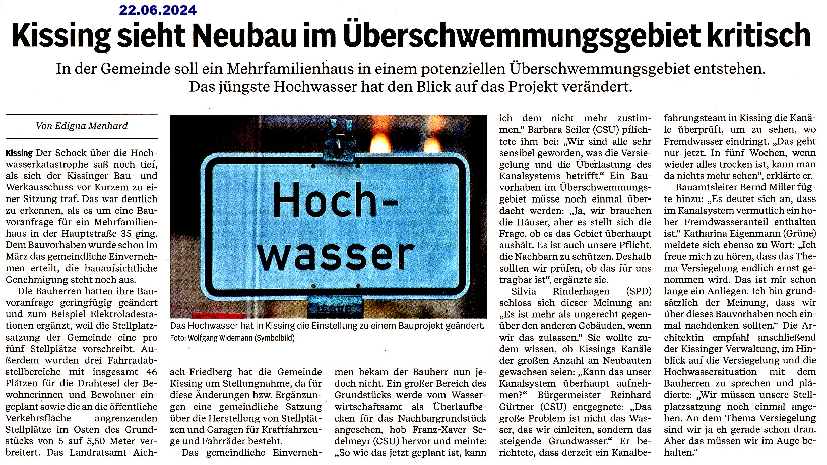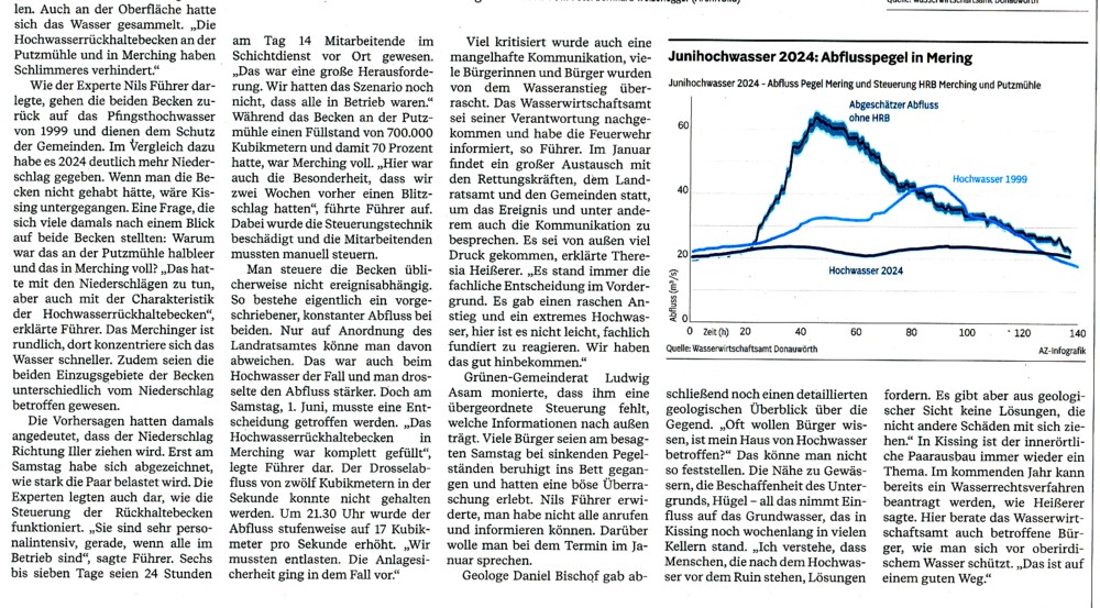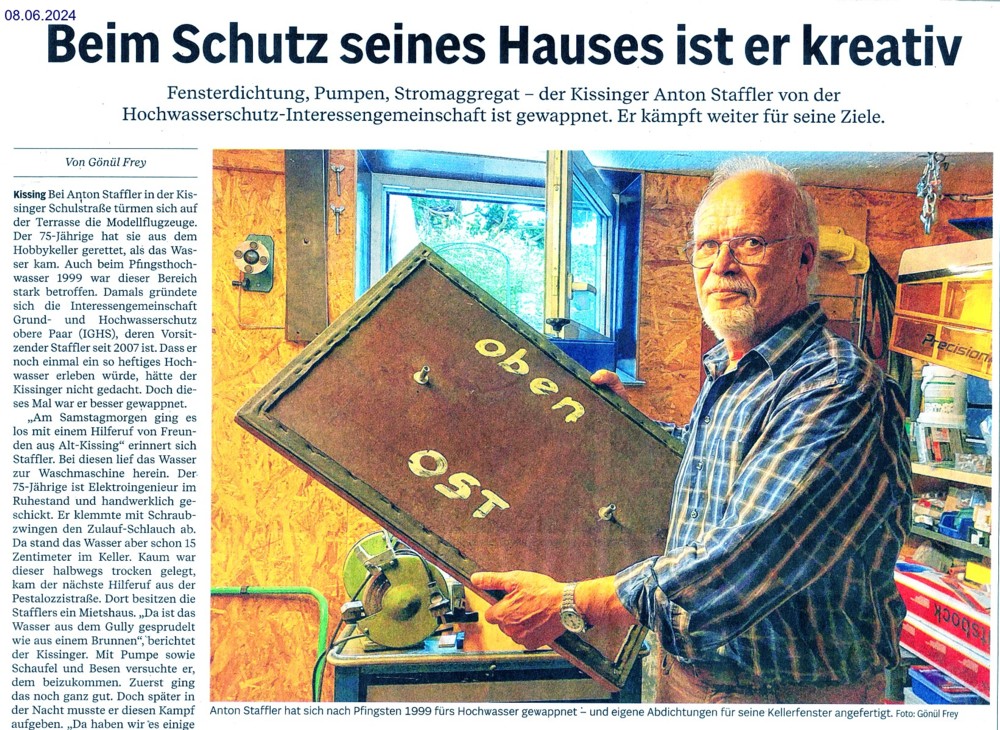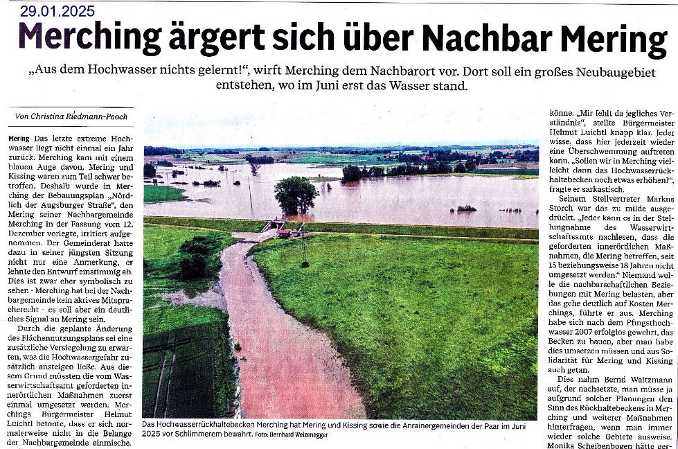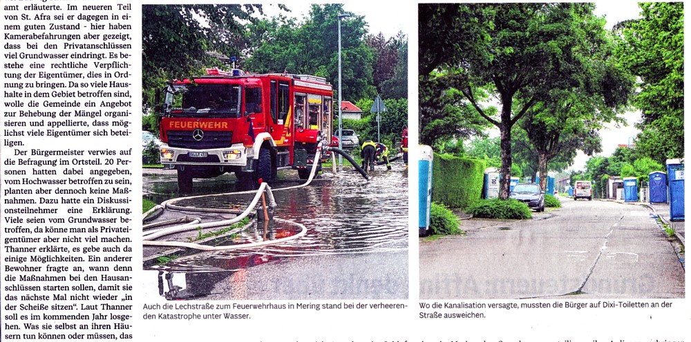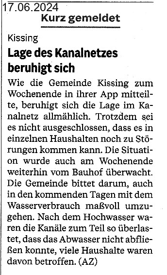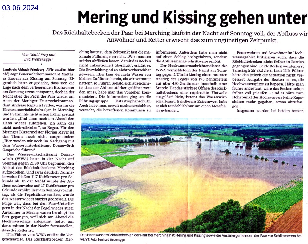 Aktualisiert am 02.08.2025Presse / Briefe / Aktuelle InformationenBerichte/Briefe zu Themen: Hochwasser/Paar/Lech 2025:29.07.2025 Leserbrief von A. Staffler zum Artikel vom 19.7.2025, s.u. 28.07.2025 Die Gemeinderat hat dem Beitritt zur "ARGE Solidarischer Hochwasserschutz" zugestimmt Der Jahresbeitrag beträgt 12.000 Euro. Ein >Digitaler Zwilling< , eine KI-App soll Vorwarn- Zeiten bis zu 24-Stunden ermöglichen, was im Katastrophenfall Zeit für gezielte Maßnahmen verschafft. 19.07.2025 Kissing prüft Beitritt zu Hochwasserprojekt (Link zur FA-Seite) Anmerkung zum Urheberrecht: Alle ab 1.8.2025 von der Friedberger Allgemeinen übernommenen Artikel dürfen nicht mehr gescannt bzw fotografiert übernommen werden. Auf diese darf nur noch per Link verwiesen werden. 11.06.2025 So steht es ums Kissinger Kanalsystem (1) und (2) (FA) 06.06.2025 Trocknet der Lech aus ? (1) und (2) (FA) 04.06.2025 Die Gemeinde Kissing muss ein neues Hochwasserschutzsystem anschaffen (FA) 30.05.2025 Ein Jahr nach dem Hochwasser (1) und (2) und (3) (FA) 11.03.2025 Technik und KI sollen vor Hochwasser schuetzen (1) und (2) (FA) 29.01.2025 Merching ärgert sich über Nachbar Mering (1) und (2) (FA) Berichte/Briefe zu Themen: Hochwasser/Paar/Lech 2024: 12.11.2024 Experten-Tipps zum Hochwasserschutz (1) und (2) und (3) (FA) 08.11.2024 Darum traf es Kissing so schwer (1) und (2) (FA) Bericht zu den Vorträgen des WWA-Don während einer Gemeinderatssitzung in Kissing 07.11.2024 Sind Anwesen bald gegen Hochwasser versicherbar? (FA) Bericht von der Jahreshauptversammlung am 15.10.2024 17.07.2024 Bauanleitung für Fenster-Dichtplatten + Bild1, Bild2, Bild3, Bild4, Bild5, Montagevideo (5 MByte) erstellt von Anton Staffler 24.06.2024 Grundwasserproblem: Welche Rolle spielt der Lech? (FA) 22.06.2024 Hochwasserschaeden von der Steuer absetzen (FA) 22.06.2024 Kissing sieht Neubau im Überschwemmungsgebiet kritisch (FA) 20.06.2024 Grundwasser im Lechtal steigt extrem (1) und (2) (FA) 20.06.2024 Wo gibt es Probleme im Kanalnetz? (1) und (2) (FA) Die Gemeinde nimmt Stellung (Kissing) 17.06.2024 Lage des Kanalnetzes beruhigt sich (FA) 15.06.2024 Fragen werden nicht beantwortet (FA-Leserbrief) 14.06.2024 Wie kann sich Mering besser schützen? (1) und (2) (FA) 12.06.2024 Warum sind die Kanäle überlastet (1) und (2) (FA) Beim lange anhaltenden Kanal-Rückstau gibt es drei große Themenbereiche: 1. Der Abwasserzweckverband Steindorf-Schmiechen-Merching-Mering-Kissing betreibt das Kanalsystem mit den beiden großen Röhren nach Augsburg. Diese wurden m.W. 1973 gebaut. Seitdem hat sich die Bevölkerungszahl nahezu verdoppelt- und es wird weiter gebaut. Muss dieses System erweitert werden? 2. Nachdem beim Schwabhof ein "Bypass" zum Augsburger Kanalsystem als Entlastungsmaßnahme gelegt wurde (eigentlich eine Überleitung) stellt sich die Frage, ob es nach dem Schwabhof eine Engstelle gibt, die man beseitigen müsste. 3. Git es Probleme, das Kissinger Kanalwasser in die beiden Röhren zu bekommen,, weil das von Mering kommende Wasser unter zu großem Druck steht? 12.06.2024 Sechs Tipps zur Hochwasservorsorge (1) und (2) (FA) Eine Zusammenstellung nützlicher Hinweise für alle Hochwasser-Geschadigten Die Berichte sprechen für sich. Zusammenfassend gilt für Mering und Kissing, dass ohne die beiden Rückhaltebecken die Schäden immens gewesen wären. Innerorts gab es nahezu kein Oberflächen- wasser. Das Grundwasser stieg auch nicht mehr so hoch wie 1999, verursachte aber trotzdem Wasser- schäden in erheblichem Umfang. Zudem drang es stärker in das Kanalnetz ein und verursachte große Schäden in den Wohnhäusern. Soviele große Pumpen habe ich in Kissing noch nie in Aktion gesehen. Heute, am 8.6., also nach 1 Woche, sind die Kanäle wieder nutzbar. Die vielerorts aufgestellten DIXI-Klos werden nicht mehr benötigt. Jetzt gilt es, nach den dringendsten Schutzmaßnahmen zu forschen: Aus Sicht der meisten Betroffenen muß das Kanalnetz schleunigst begutachtet und, wo nötig (fast überall) saniert oder punktuell komplett erneuert werden- Besonders die beiden großen Röhren von Mering bis Augsburg, westlich der B2, erwiesen sich als viel zu klein. Es gab tagelangen Rückstau.im Kanalnetz. 08.06.2024 Ursachen des Hochwassers (ein treffender Leserbrief aus FA) 08.06.2024 Beim Schutz seines Hauses ist er kreativ (1) und (2) (FA) 04.06.2024 Jetzt wird das Grundwasser zum Problem (FA) 04.06.2024 Becken sind weiterhin gut gefüllt (FA) 03.06.2024 Mering und Kissing gehen unter (1) und (2) (FA) 03.06.2024 Hochwasser in den umliegenden Gemeinden (FA) 03.06.2024 Land unter im Wittelsbacher Land (1) und (2) (FA) Das jahrelang befürchtete, große Hochwasser hat bis zum Juni 2024 gewartet, bis die Merchinger Staustufe endlich fertig war! Am 1.6. wurden beide Rückhalte- becken ihrer Feuertaufe unterzogen - und haben sie bestanden. Wenn es 1999 kein großes Hochwasser gegeben hätte, wären die beiden Becken nicht gebaut worden ! 28.05.2024 Uniper treibt Plaene fuer Wasserkraftwerk am Lech voran (FA) Im Hinblick auf Hochwassergefährdung ist gegen das Fließkraftwerk von Uniper nichts einzuwenden. 24.05.2024 Leserbrief- Vermeidbare Flutschaeden (FA) Der Leserbrief wendet sich gegen die "menschengemachten" Ursachen für Hochwassersituationen. Unsere Regierung und die EU, weniger die Bauern, die sich nur anpassen ( müssen) tragen dafür die Verantwortung. 13.04.2024 Vor mehr als 150 Jahren begann die Bändigung des Lechs (1) (FA) Vor mehr als 150 Jahren begann die Bändigung des Lechs (2) (FA) Der Artikel beschreibt, wie der Lech seit 1852 reguliert, kanalisiert, drangsaliert wurde. Dies mündete letztlich in den Bau von 23 Staustufen, die dem Lech jegliche Eigendynamik nahmen. Mit licca liber soll ihm nun in einem kleinen Teilstück wieder etwas Freiheit zugestanden werden - zum Vorteil von Natur und Hochwasserschutz. Berichte/Briefe zu Themen: Hochwasser/Paar/Lech 2023: 29.07.2023 In Kissing kommt die Gefahr von unten (FA) Beim Pfingsthochwasser 1