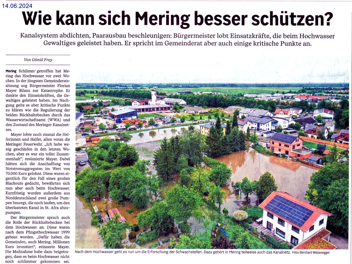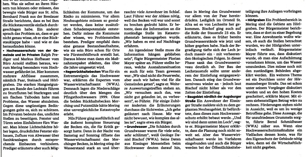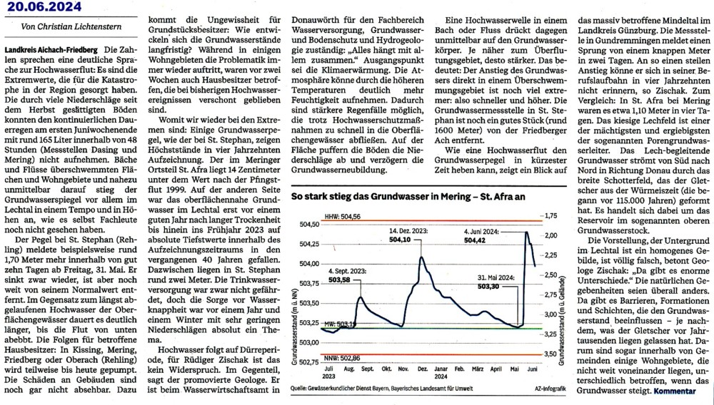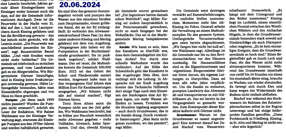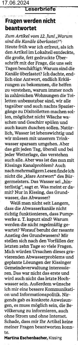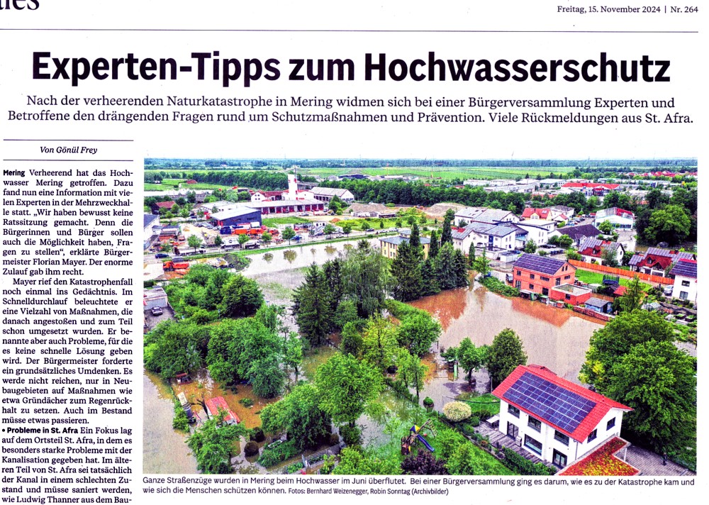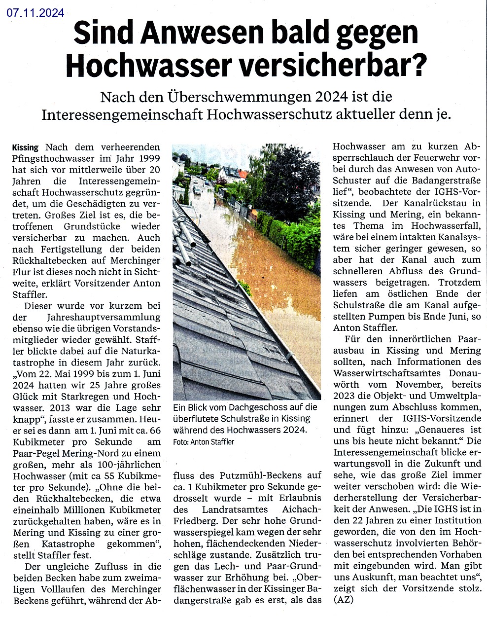 Aktualisiert am 02.08.2025Presse / Briefe / Aktuelle InformationenBerichte/Briefe zu Themen: Hochwasser/Paar/Lech 2025:29.07.2025 Leserbrief von A. Staffler zum Artikel vom 19.7.2025, s.u. 28.07.2025 Die Gemeinderat hat dem Beitritt zur "ARGE Solidarischer Hochwasserschutz" zugestimmt Der Jahresbeitrag beträgt 12.000 Euro. Ein >Digitaler Zwilling< , eine KI-App soll Vorwarn- Zeiten bis zu 24-Stunden ermöglichen, was im Katastrophenfall Zeit für gezielte Maßnahmen verschafft. 19.07.2025 Kissing prüft Beitritt zu Hochwasserprojekt (Link zur FA-Seite) Anmerkung zum Urheberrecht: Alle ab 1.8.2025 von der Friedberger Allgemeinen übernommenen Artikel dürfen nicht mehr gescannt bzw fotografiert übernommen werden. Auf diese darf nur noch per Link verwiesen werden. 11.06.2025 So steht es ums Kissinger Kanalsystem (1) und (2) (FA) 06.06.2025 Trocknet der Lech aus ? (1) und (2) (FA) 04.06.2025 Die Gemeinde Kissing muss ein neues Hochwasserschutzsystem anschaffen (FA) 30.05.2025 Ein Jahr nach dem Hochwasser (1) und (2) und (3) (FA) 11.03.2025 Technik und KI sollen vor Hochwasser schuetzen (1) und (2) (FA) 29.01.2025 Merching ärgert sich über Nachbar Mering (1) und (2) (FA) Berichte/Briefe zu Themen: Hochwasser/Paar/Lech 2024: 12.11.2024 Experten-Tipps zum Hochwasserschutz (1) und (2) und (3) (FA) 08.11.2024 Darum traf es Kissing so schwer (1) und (2) (FA) Bericht zu den Vorträgen des WWA-Don während einer Gemeinderatssitzung in Kissing 07.11.2024 Sind Anwesen bald gegen Hochwasser versicherbar? (FA) Bericht von der Jahreshauptversammlung am 15.10.2024 17.07.2024 Bauanleitung für Fenster-Dichtplatten + Bild1, Bild2, Bild3, Bild4, Bild5, Montagevideo (5 MByte) erstellt von Anton Staffler 24.06.2024 Grundwasserproblem: Welche Rolle spielt der Lech? (FA) 22.06.2024 Hochwasserschaeden von der Steuer absetzen (FA) 22.06.2024 Kissing sieht Neubau im Überschwemmungsgebiet kritisch (FA) 20.06.2024 Grundwasser im Lechtal steigt extrem (1) und (2) (FA) 20.06.2024 Wo gibt es Probleme im Kanalnetz? (1) und (2) (FA) Die Gemeinde nimmt Stellung (Kissing) 17.06.2024 Lage des Kanalnetzes beruhigt sich (FA) 15.06.2024 Fragen werden nicht beantwortet (FA-Leserbrief) 14.06.2024 Wie kann sich Mering besser schützen? (1) und (2) (FA) 12.06.2024 Warum sind die Kanäle überlastet (1) und (2) (FA) Beim lange anhaltenden Kanal-Rückstau gibt es drei große Themenbereiche: 1. Der Abwasserzweckverband Steindorf-Schmiechen-Merching-Mering-Kissing betreibt das Kanalsystem mit den beiden großen Röhren nach Augsburg. Diese wurden m.W. 1973 gebaut. Seitdem hat sich die Bevölkerungszahl nahezu verdoppelt- und es wird weiter gebaut. Muss dieses System erweitert werden? 2. Nachdem beim Schwabhof ein "Bypass" zum Augsburger Kanalsystem als Entlastungsmaßnahme gelegt wurde (eigentlich eine Überleitung) stellt sich die Frage, ob es nach dem Schwabhof eine Engstelle gibt, die man beseitigen müsste. 3. Git es Probleme, das Kissinger Kanalwasser in die beiden Röhren zu bekommen,, weil das von Mering kommende Wasser unter zu großem Druck steht? 12.06.2024 Sechs Tipps zur Hochwasservorsorge (1) und (2) (FA) Eine Zusammenstellung nützlicher Hinweise für alle Hochwasser-Geschadigten Die Berichte sprechen für sich. Zusammenfassend gilt für Mering und Kissing, dass ohne die beiden Rückhaltebecken die Schäden immens gewesen wären. Innerorts gab es nahezu kein Oberflächen- wasser. Das Grundwasser stieg auch nicht mehr so hoch wie 1999, verursachte aber trotzdem Wasser- schäden in erheblichem Umfang. Zudem drang es stärker in das Kanalnetz ein und verursachte große Schäden in den Wohnhäusern. Soviele große Pumpen habe ich in Kissing noch nie in Aktion gesehen. Heute, am 8.6., also nach 1 Woche, sind die Kanäle wieder nutzbar. Die vielerorts aufgestellten DIXI-Klos werden nicht mehr benötigt. Jetzt gilt es, nach den dringendsten Schutzmaßnahmen zu forschen: Aus Sicht der meisten Betroffenen muß das Kanalnetz schleunigst begutachtet und, wo nötig (fast überall) saniert oder punktuell komplett erneuert werden- Besonders die beiden großen Röhren von Mering bis Augsburg, westlich der B2, erwiesen sich als viel zu klein. Es gab tagelangen Rückstau.im Kanalnetz. 08.06.2024 Ursachen des Hochwassers (ein treffender Leserbrief aus FA) 08.06.2024 Beim Schutz seines Hauses ist er kreativ (1) und (2) (FA) 04.06.2024 Jetzt wird das Grundwasser zum Problem (FA) 04.06.2024 Becken sind weiterhin gut gefüllt (FA) 03.06.2024 Mering und Kissing gehen unter (1) und (2) (FA) 03.06.2024 Hochwasser in den umliegenden Gemeinden (FA) 03.06.2024 Land unter im Wittelsbacher Land (1) und (2) (FA) Das jahrelang befürchtete, große Hochwasser hat bis zum Juni 2024 gewartet, bis die Merchinger Staustufe endlich fertig war! Am 1.6. wurden beide Rückhalte- becken ihrer Feuertaufe unterzogen - und haben sie bestanden. Wenn es 1999 kein großes Hochwasser gegeben hätte, wären die beiden Becken nicht gebaut worden ! 28.05.2024 Uniper treibt Plaene fuer Wasserkraftwerk am Lech voran (FA) Im Hinblick auf Hochwassergefährdung ist gegen das Fließkraftwerk von Uniper nichts einzuwenden. 24.05.2024 Leserbrief- Vermeidbare Flutschaeden (FA) Der Leserbrief wendet sich gegen die "menschengemachten" Ursachen für Hochwassersituationen. Unsere Regierung und die EU, weniger die Bauern, die sich nur anpassen ( müssen) tragen dafür die Verantwortung. 13.04.2024 Vor mehr als 150 Jahren begann die Bändigung des Lechs (1) (FA) Vor mehr als 150 Jahren begann die Bändigung des Lechs (2) (FA) Der Artikel beschreibt, wie der Lech seit 1852 reguliert, kanalisiert, drangsaliert wurde. Dies mündete letztlich in den Bau von 23 Staustufen, die dem Lech jegliche Eigendynamik nahmen. Mit licca liber soll ihm nun in einem kleinen Teilstück wieder etwas Freiheit zugestanden werden - zum Vorteil von Natur und Hochwasserschutz. Berichte/Briefe zu Themen: Hochwasser/Paar/Lech 2023: 29.07.2023 In Kissing kommt die Gefahr von unten (FA) Beim Pfingsthochwasser 1