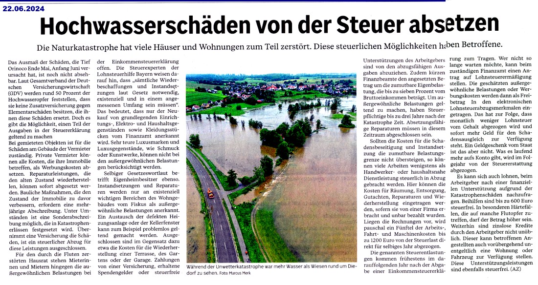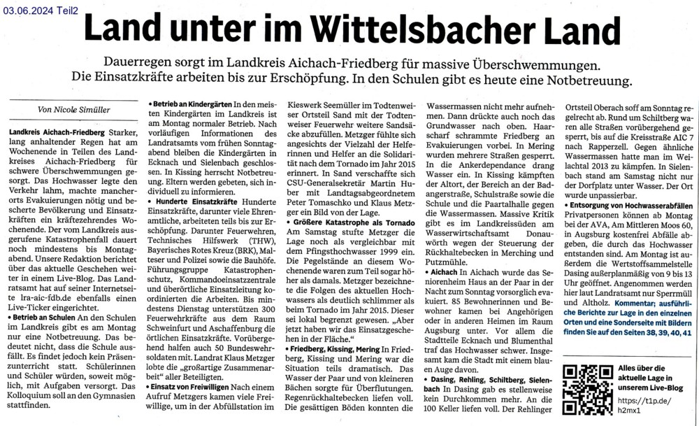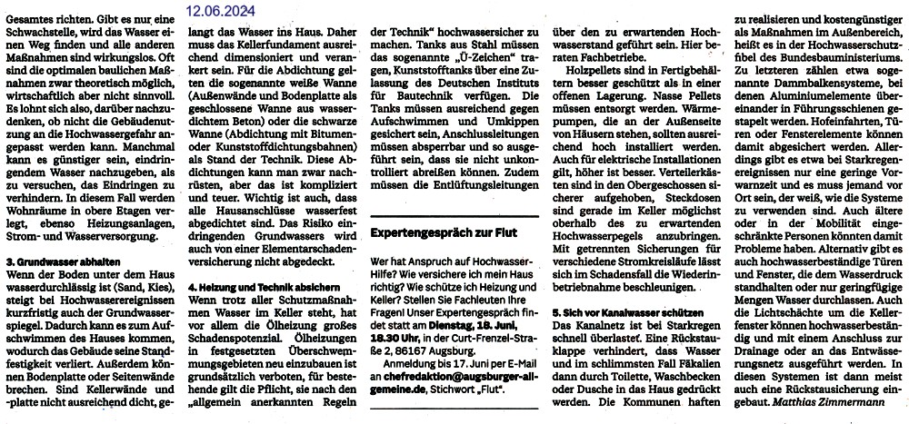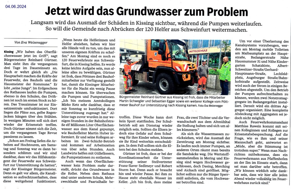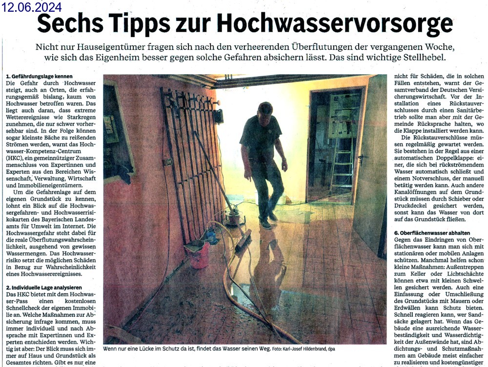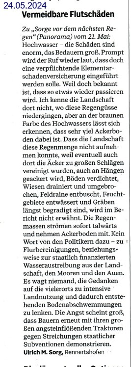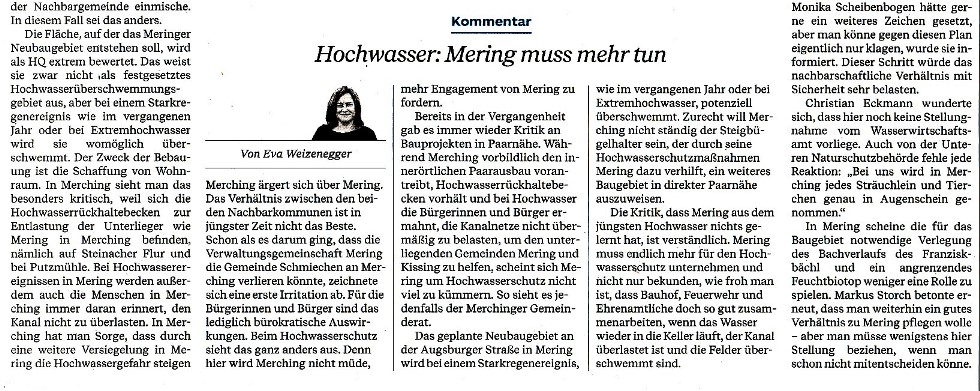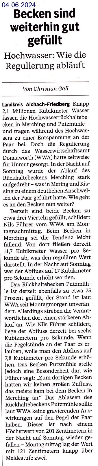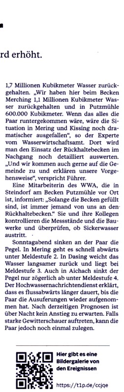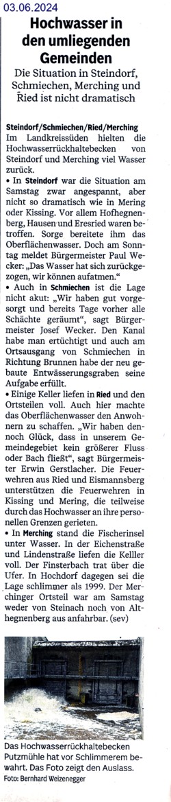 Aktualisiert am 02.08.2025Presse / Briefe / Aktuelle InformationenBerichte/Briefe zu Themen: Hochwasser/Paar/Lech 2025:29.07.2025 Leserbrief von A. Staffler zum Artikel vom 19.7.2025, s.u. 28.07.2025 Die Gemeinderat hat dem Beitritt zur "ARGE Solidarischer Hochwasserschutz" zugestimmt Der Jahresbeitrag beträgt 12.000 Euro. Ein >Digitaler Zwilling< , eine KI-App soll Vorwarn- Zeiten bis zu 24-Stunden ermöglichen, was im Katastrophenfall Zeit für gezielte Maßnahmen verschafft. 19.07.2025 Kissing prüft Beitritt zu Hochwasserprojekt (Link zur FA-Seite) Anmerkung zum Urheberrecht: Alle ab 1.8.2025 von der Friedberger Allgemeinen übernommenen Artikel dürfen nicht mehr gescannt bzw fotografiert übernommen werden. Auf diese darf nur noch per Link verwiesen werden. 11.06.2025 So steht es ums Kissinger Kanalsystem (1) und (2) (FA) 06.06.2025 Trocknet der Lech aus ? (1) und (2) (FA) 04.06.2025 Die Gemeinde Kissing muss ein neues Hochwasserschutzsystem anschaffen (FA) 30.05.2025 Ein Jahr nach dem Hochwasser (1) und (2) und (3) (FA) 11.03.2025 Technik und KI sollen vor Hochwasser schuetzen (1) und (2) (FA) 29.01.2025 Merching ärgert sich über Nachbar Mering (1) und (2) (FA) Berichte/Briefe zu Themen: Hochwasser/Paar/Lech 2024: 12.11.2024 Experten-Tipps zum Hochwasserschutz (1) und (2) und (3) (FA) 08.11.2024 Darum traf es Kissing so schwer (1) und (2) (FA) Bericht zu den Vorträgen des WWA-Don während einer Gemeinderatssitzung in Kissing 07.11.2024 Sind Anwesen bald gegen Hochwasser versicherbar? (FA) Bericht von der Jahreshauptversammlung am 15.10.2024 17.07.2024 Bauanleitung für Fenster-Dichtplatten + Bild1, Bild2, Bild3, Bild4, Bild5, Montagevideo (5 MByte) erstellt von Anton Staffler 24.06.2024 Grundwasserproblem: Welche Rolle spielt der Lech? (FA) 22.06.2024 Hochwasserschaeden von der Steuer absetzen (FA) 22.06.2024 Kissing sieht Neubau im Überschwemmungsgebiet kritisch (FA) 20.06.2024 Grundwasser im Lechtal steigt extrem (1) und (2) (FA) 20.06.2024 Wo gibt es Probleme im Kanalnetz? (1) und (2) (FA) Die Gemeinde nimmt Stellung (Kissing) 17.06.2024 Lage des Kanalnetzes beruhigt sich (FA) 15.06.2024 Fragen werden nicht beantwortet (FA-Leserbrief) 14.06.2024 Wie kann sich Mering besser schützen? (1) und (2) (FA) 12.06.2024 Warum sind die Kanäle überlastet (1) und (2) (FA) Beim lange anhaltenden Kanal-Rückstau gibt es drei große Themenbereiche: 1. Der Abwasserzweckverband Steindorf-Schmiechen-Merching-Mering-Kissing betreibt das Kanalsystem mit den beiden großen Röhren nach Augsburg. Diese wurden m.W. 1973 gebaut. Seitdem hat sich die Bevölkerungszahl nahezu verdoppelt- und es wird weiter gebaut. Muss dieses System erweitert werden? 2. Nachdem beim Schwabhof ein "Bypass" zum Augsburger Kanalsystem als Entlastungsmaßnahme gelegt wurde (eigentlich eine Überleitung) stellt sich die Frage, ob es nach dem Schwabhof eine Engstelle gibt, die man beseitigen müsste. 3. Git es Probleme, das Kissinger Kanalwasser in die beiden Röhren zu bekommen,, weil das von Mering kommende Wasser unter zu großem Druck steht? 12.06.2024 Sechs Tipps zur Hochwasservorsorge (1) und (2) (FA) Eine Zusammenstellung nützlicher Hinweise für alle Hochwasser-Geschadigten Die Berichte sprechen für sich. Zusammenfassend gilt für Mering und Kissing, dass ohne die beiden Rückhaltebecken die Schäden immens gewesen wären. Innerorts gab es nahezu kein Oberflächen- wasser. Das Grundwasser stieg auch nicht mehr so hoch wie 1999, verursachte aber trotzdem Wasser- schäden in erheblichem Umfang. Zudem drang es stärker in das Kanalnetz ein und verursachte große Schäden in den Wohnhäusern. Soviele große Pumpen habe ich in Kissing noch nie in Aktion gesehen. Heute, am 8.6., also nach 1 Woche, sind die Kanäle wieder nutzbar. Die vielerorts aufgestellten DIXI-Klos werden nicht mehr benötigt. Jetzt gilt es, nach den dringendsten Schutzmaßnahmen zu forschen: Aus Sicht der meisten Betroffenen muß das Kanalnetz schleunigst begutachtet und, wo nötig (fast überall) saniert oder punktuell komplett erneuert werden- Besonders die beiden großen Röhren von Mering bis Augsburg, westlich der B2, erwiesen sich als viel zu klein. Es gab tagelangen Rückstau.im Kanalnetz. 08.06.2024 Ursachen des Hochwassers (ein treffender Leserbrief aus FA) 08.06.2024 Beim Schutz seines Hauses ist er kreativ (1) und (2) (FA) 04.06.2024 Jetzt wird das Grundwasser zum Problem (FA) 04.06.2024 Becken sind weiterhin gut gefüllt (FA) 03.06.2024 Mering und Kissing gehen unter (1) und (2) (FA) 03.06.2024 Hochwasser in den umliegenden Gemeinden (FA) 03.06.2024 Land unter im Wittelsbacher Land (1) und (2) (FA) Das jahrelang befürchtete, große Hochwasser hat bis zum Juni 2024 gewartet, bis die Merchinger Staustufe endlich fertig war! Am 1.6. wurden beide Rückhalte- becken ihrer Feuertaufe unterzogen - und haben sie bestanden. Wenn es 1999 kein großes Hochwasser gegeben hätte, wären die beiden Becken nicht gebaut worden ! 28.05.2024 Uniper treibt Plaene fuer Wasserkraftwerk am Lech voran (FA) Im Hinblick auf Hochwassergefährdung ist gegen das Fließkraftwerk von Uniper nichts einzuwenden. 24.05.2024 Leserbrief- Vermeidbare Flutschaeden (FA) Der Leserbrief wendet sich gegen die "menschengemachten" Ursachen für Hochwassersituationen. Unsere Regierung und die EU, weniger die Bauern, die sich nur anpassen ( müssen) tragen dafür die Verantwortung. 13.04.2024 Vor mehr als 150 Jahren begann die Bändigung des Lechs (1) (FA) Vor mehr als 150 Jahren begann die Bändigung des Lechs (2) (FA) Der Artikel beschreibt, wie der Lech seit 1852 reguliert, kanalisiert, drangsaliert wurde. Dies mündete letztlich in den Bau von 23 Staustufen, die dem Lech jegliche Eigendynamik nahmen. Mit licca liber soll ihm nun in einem kleinen Teilstück wieder etwas Freiheit zugestanden werden - zum Vorteil von Natur und Hochwasserschutz. Berichte/Briefe zu Themen: Hochwasser/Paar/Lech 2023: 29.07.2023 In Kissing kommt die Gefahr von unten (FA) Beim Pfingsthochwasser 1